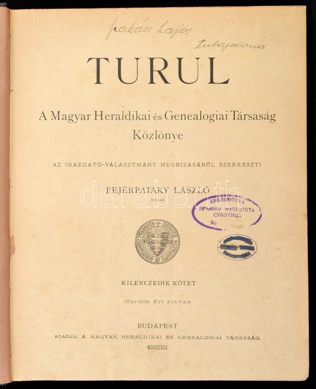 Description: Turul. A Magyar Heraldikai és Genealogiai Társaság Közlönye. Az igazgató-választmány megbízásából szerkesztik báró Nyáry Albert és Fejérpataky László. 3-4. kötet, egybekötve. 1891-, 1892-dik évi folyam.