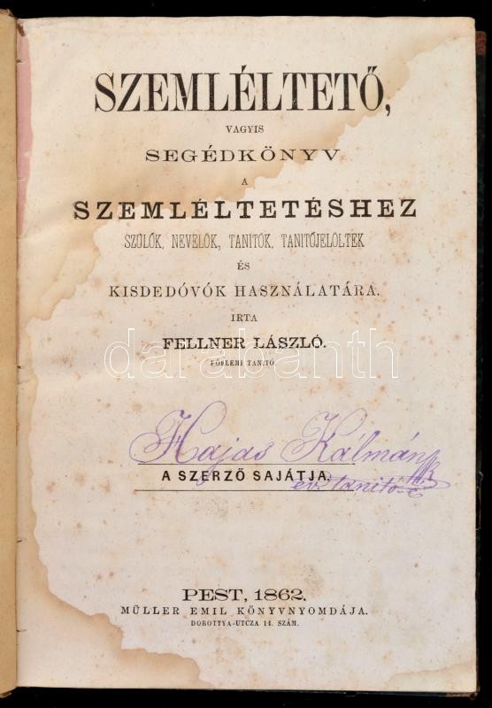 Fellner László: Szemléltető, vagyis segédkönyv a szemléltetéshez szülők, nevelők, tanítók, tanítójelöltek és kisdedóvók használatára. Pest, 1862, szerzői (Müller Emil Könyvnyomdája). Helyenként foltos lapokkal, kopott félvászon kötésben.