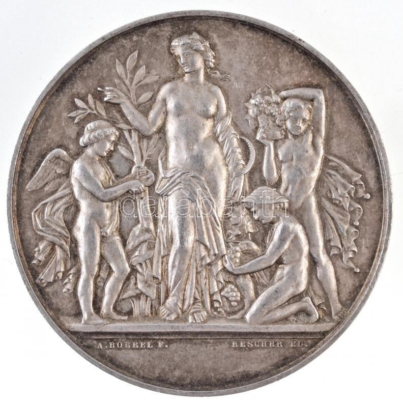 Franciaország 1896. "Société d'Horticulture de Boulogne-sur-Seine - Mr. Deliege (Boulogne-sur-Seine-i Kertészeti Társaság - Mr. Deliege)" peremén jelzett Ag emlékérem "BESCHER ED" gyártói(?) jelzéssel. Szign.: A. BORREL F. (61,17g/51mm) T:2 patina, kis ph.