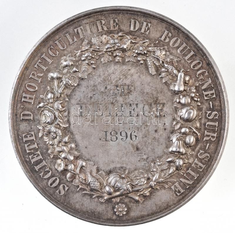 / France 1896. "Société d'Horticulture de Boulogne-sur-Seine - Mr. Deliege (Horticulture Society of Boulogne-sur-Seine - Mr. Deliege)" Ag commemorative medal, marked on edge, with "BESCHER ED" makers(?) mark. Sign.: A. BORREL F. (61,17g/51mm) C:XF patina, small edge error
