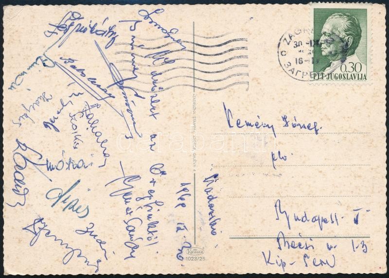 1969 A magyar öregfiúk labdarúgó válogatott tagjai által aláírt, Zágrábból küldött képeslap, közte 4 korábbi Aranycsapat taggal (Mátrai, Zakariás, Szojka, Hidegkúti, Buzánszky,Fenyvesi, Budai, Babolcsai...stb)