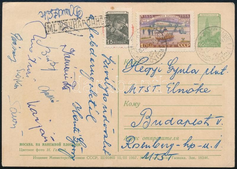 cca 1960 Magyar labdarúgók által és Honti György MLSZ elnök által aláírt Moszkvából Hegyi Gyula (1897-1978) MTST elnök, MOB elnöknek küldött képeslap