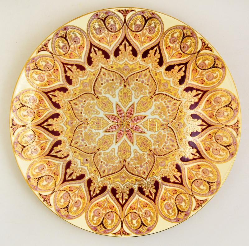 Zsolnay óriás dísztál orientalizáló mintával, kézzel festett, jelzett (Bosnyák Tiborné), hibátlan, d:64 cm / Zsolnay decorative plate with Oriental motifs, handpainted, with hallmark (Bosnyák Tiborné), in flawless condition, d: 64 cm