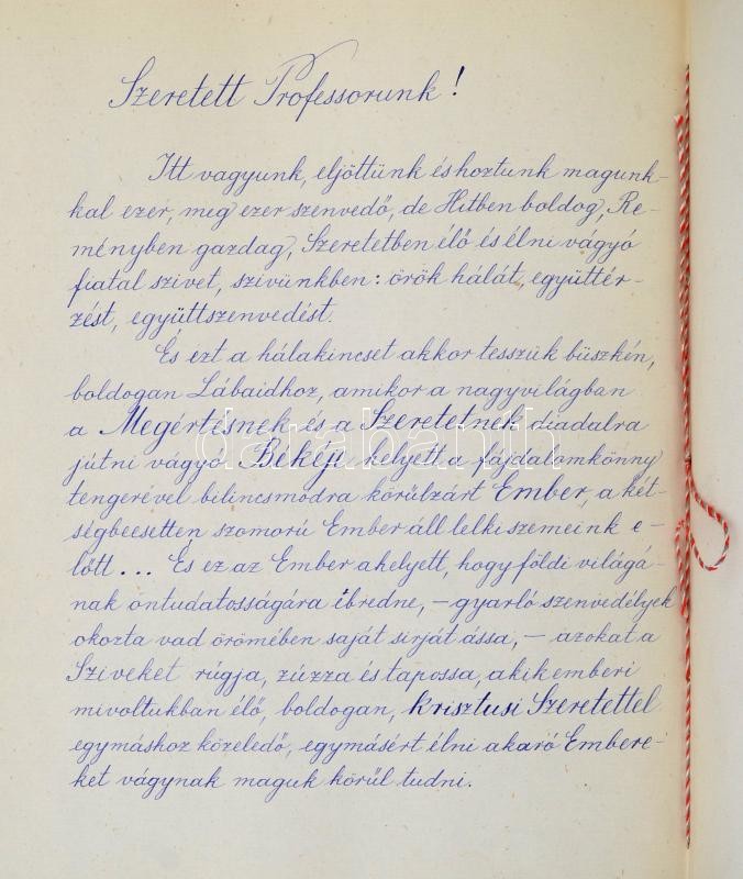 Description: 1919 május 11. dr. Lechner Károly orvosprofersszornak, a kolozsvári egyetem dékánjának írt levél tanítványaitól, a román megszállás alkalmából. A kézzel írott levélben hazafias hangon biztosítják együttérzésükről és kitartásra biztatják. Hozzá idézettel díszített nemzetiszín szalag a megszállás dátumával. A levél igényes aranyozott vászon kötésben. 21x26 cm