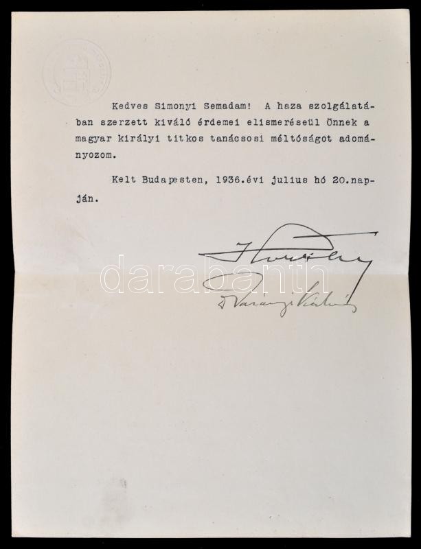 1936 Horthy Miklós titkos tanácsossá nevezi ki Simonyi-Semadam Sándor ... https://www.darabanth.com/en/29-Major-auction/29.1/Other-collectibles/Historical-documents-manuscripts~12115/1936-Horthy-Miklos-titkos-tanacsossa-nevezi-ki-Simonyi-Semadam-Sandor-1864-1946-korabbi-minis~II1759447