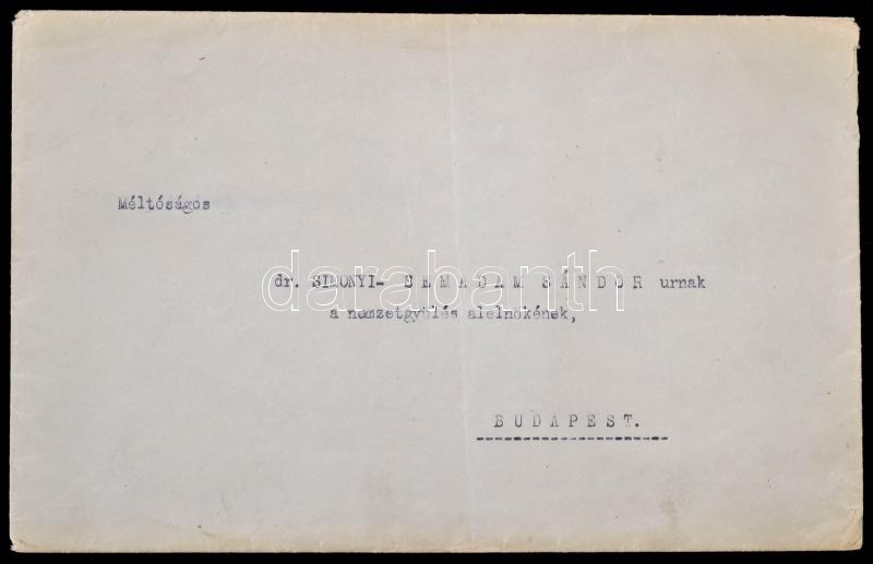 Description: 1936 Horthy Miklós titkos tanácsossá nevezi ki Simonyi-Semadam Sándor (1864-1946) korábbi miniszterelnököt, ekkor a Magyar Jelzálog Hitelbank kormánybiztosát, Horthy és Darányi Kálmán (1886-1939) földművelésügyi miniszter (1935-1938), későbbi miniszterelnök (1936-1938) aláírásával, "a nemzetgyűlés alelnökének" címzett borítékkal