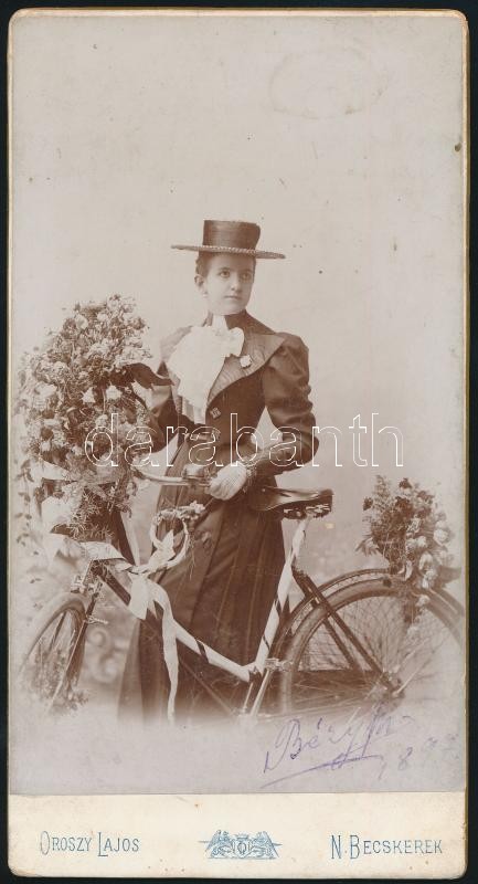 1897 A Nagybecskereki Kerékpár Egylet (női közül az első) egyik tagjának keméynhátú fotója, szignált, Oroszy Lajos műterméből, 20×10 cm
