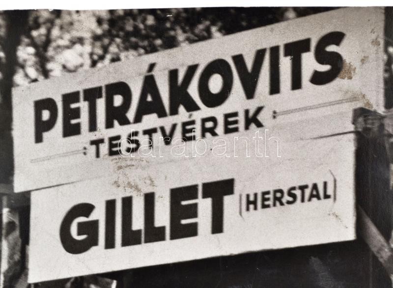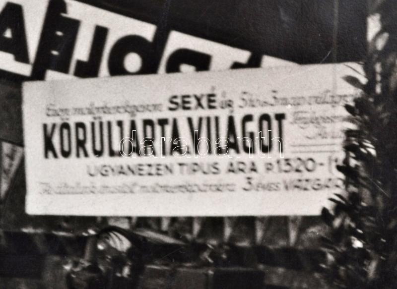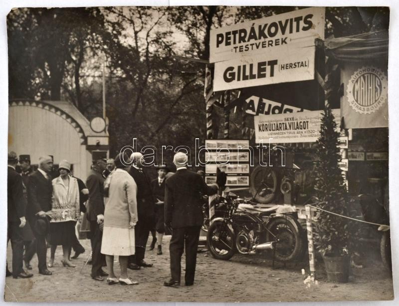 1927 Budapest, látogatók Robert Sexé (1890-1986) francia motoros világkörüli utazó kiállításán, a Petrákovits Testvérek, a Mathis és a Gillet-Herstal reklámjával, nagyméretű fotó, Munkácsi Márton (1896-1963) felvétele, hátulján pecséttel jelzett, kis sérüléssel, 22×29 cm / 1927, Budapest, visitors at the exhibition of Robert Sexé (1890-1986) French motocyclist and globetrotter, with various advertisements, e. g. Gillet-Herstal, photography taken by Martin Munkácsi (1896-1963), with stamp on its back, with small damage, 22×29 cm