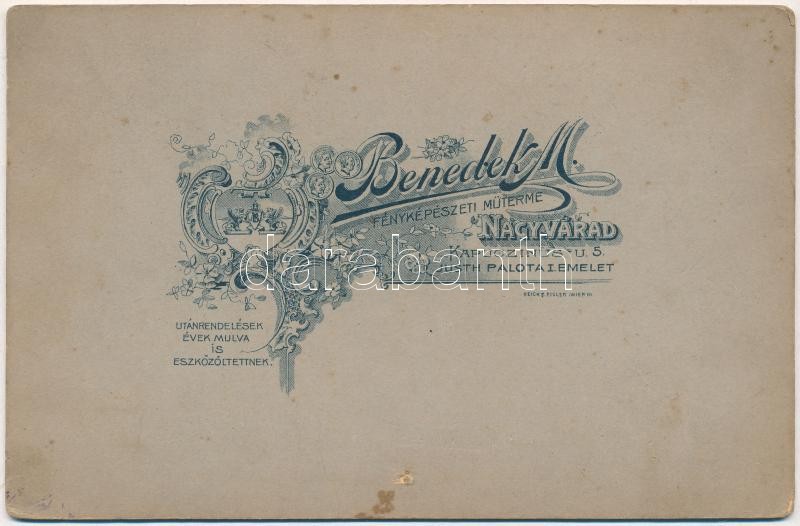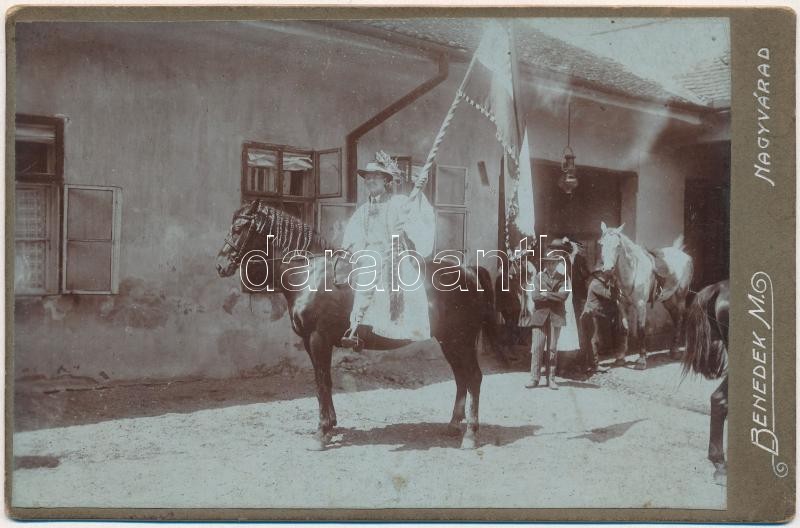 cca 1880 Lovas ünnepi díszben, keményhátú fotó Benedek Mór nagyváradi műterméből, 11×16 cm