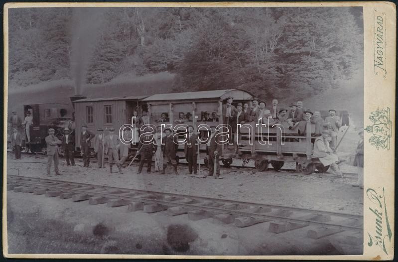 cca 1880 Vonat és utazóközönsége a Jád völgyében, keményhátú fotó Zsunk Pál nagyváradi műterméből, 11×16,5 cm