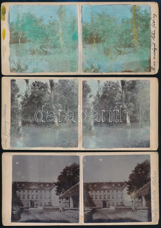 cca 1900 Életképek Holics és Göding (ma: Holič, Szlovákia ill. Hodonín, Csehország) környékéről: árvíz az országút mentén, erdőrészlet, kastély, 3 db sztereofotó, feliratozva, 8×18 cm / cca 1900 The surroundings of Holič (Slovakia) and Hodonín/Göding (Czech Republic): flood near the main road, forest, etc., 3 stereoscopic images, with notes on their back, 8×18 cm