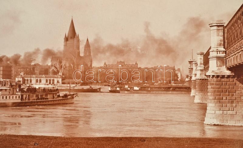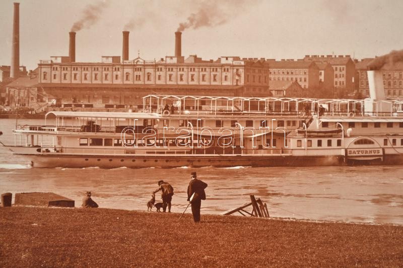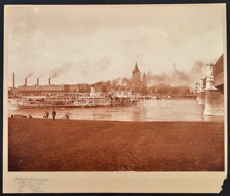 cca 1920 Bécs, az Assisi Szt. Ferenc templom, előtérben a Saturnus gőzhajóval, jobbra a Rudolf főherceg-híd (ma Reichsbrücke), nagyméretű fotó Marianne Strobl utóda bécsi műterméből, kartonra ragasztva, hátulján feliratozva, 23×29,5 cm / cca 1920 Wien/Vienna, the St. Francis of Assisi Church, with the Saturnus steam ship in the foreground, with the Reichsbrücke to the right, photograph from the atelier of the heir of Marianne Strobl, on cardboard, with notes on its back, 23×29,5 cm