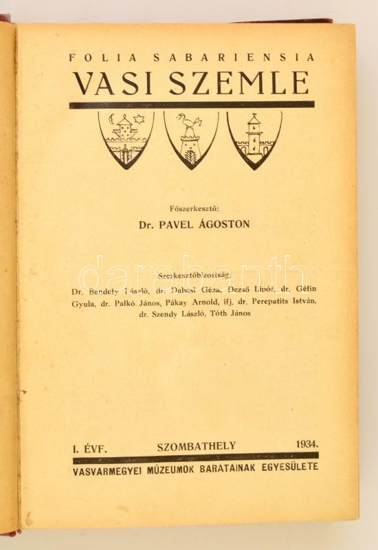 1934-35 A Vasi Szemle c. folyóirat induló évfolyama bekötve. Benne számos érdekes tanulmány: Jáki gerencsérek, Burgenland magyar névéről, stb.