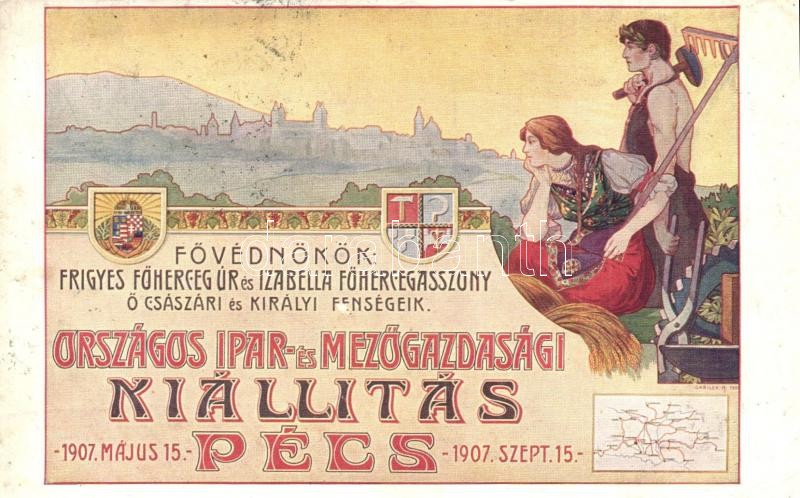 Description: 1907 Pécs, Országos Ipar- és Mezőgazdasági Kiállítás reklámlapja / National Industrial and Agricultural Exhibition, advertisement card s: Darilek H. (EK)