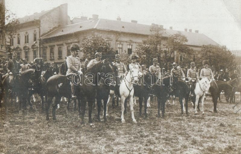 Description: 1913 Budapest, Gróf Marenzzi F. altábor, a honvéd főparancsnok helyettese a fegyvertárban szemlét tart, mögötte Lippner Károly ezredes és Paleta Jenő alezredes. Mizser István tizedes írása a hátoldalon / Count Marenzzi Lieutenant General with Colonel Lippner and lieutenant-colonel Paleta. Corporal Mizser's letter on the backside. Schäffer Armin photo