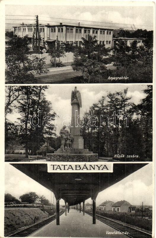 1938 Tatabánya, Anyagraktár, Hősök szobra, vasútállomás a vágányokkal....