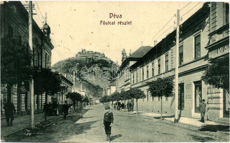 1910 Déva, Fő utca háttérben a várral, Fehér Kereszt szálloda és kávéh...