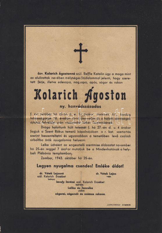 1943 Kolarich Ágoston nyugalmazott honvédszázados (Zombor) gyászjelentése
