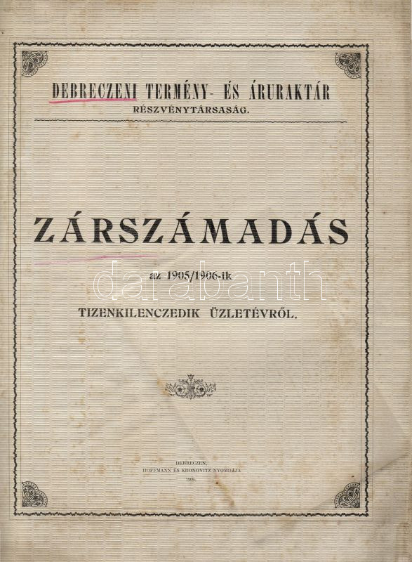 Debreczeni Termény- és Áruraktár Rt. zárszámadása az 1905/06 évről; Hoffmann és Kronovitz nyomdája