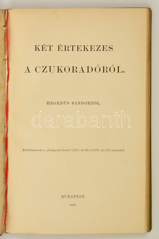 Hegedűs Sándor: Két értekezés a czukoradóról. Bp., 1887. Különlenyomat. 57p. + hozzákötve