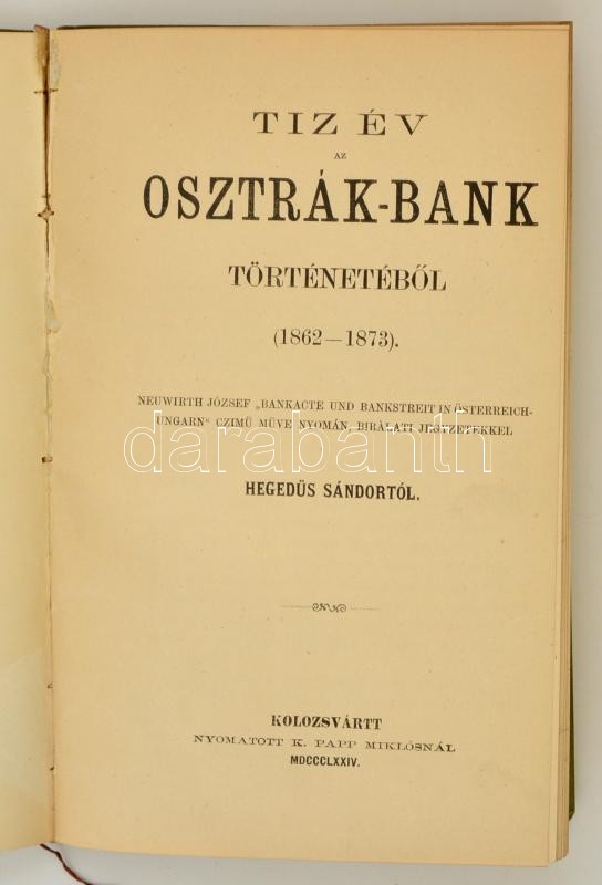 Hegedűs Sándor: Tíz év az Osztrák Bank történetéből. 1862-1873. Kolozsvár, 1874. K. Papp Miklós. 48p.