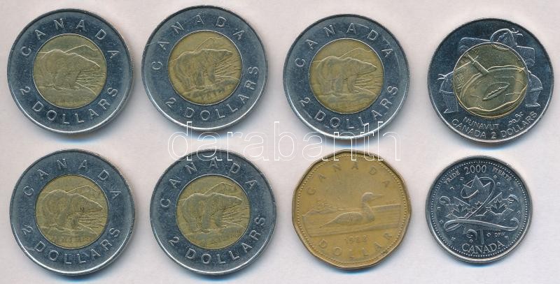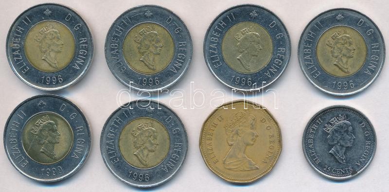 Kanada 1988. 1$ Br-Ni "II. Erzsébet" + 1996. 2$ Al-Br-Ni "II. Erzsébet" (5x) + 1999. 2$ Al-Br-Ni "II. Erzsébet" + 2000. 25c Ni T:1--3