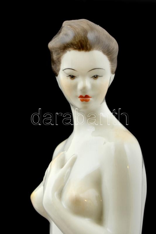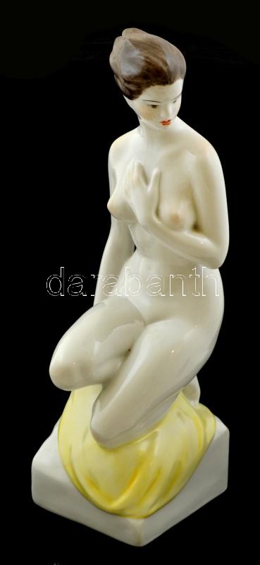 Hollóházi térdelő akt, kézzel festett, jelzett, hibátlan, m:29 cm