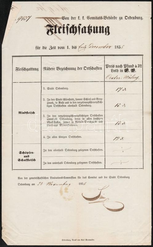 1858 Sopron, Sopron vármegye hatósága által kiadott húsárszabás