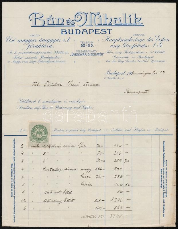 https://www.darabanth.com/en/290-Online-auction/290.0/Other-collectibles/Documents~100017/1920-Ban-es-Mihalik-uveggyar-fejleces-szamlaja-10-filleres-illetekbelyeggel~II1527658