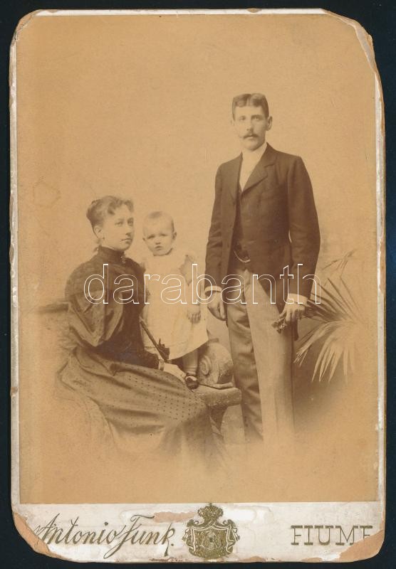 Description: 1896 Wiettinghof Gyula (1867-1909) m. kir. központi dohányjövedéki igazgatósági titkári, felesége Lukse-Fábry Mária Hilda és Gyermekük, keményhátú fotó, Fiume, Antonio Funk, a fotó sarkai viseltesek, 16x11 cm.