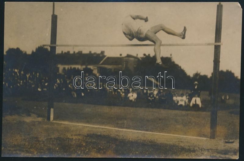 1914 Fábián (Lajos) atléta (MAFC) győz magasugrásban versenyén, Bécsben, fotó, a hátoldalán feliratozott, 10x16 cm.