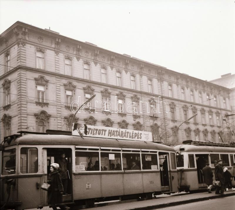 1969 Budapest, mozifilm reklámok villamosokon, 2 db szabadon felhasználható vintage negatív, 6x6 cm