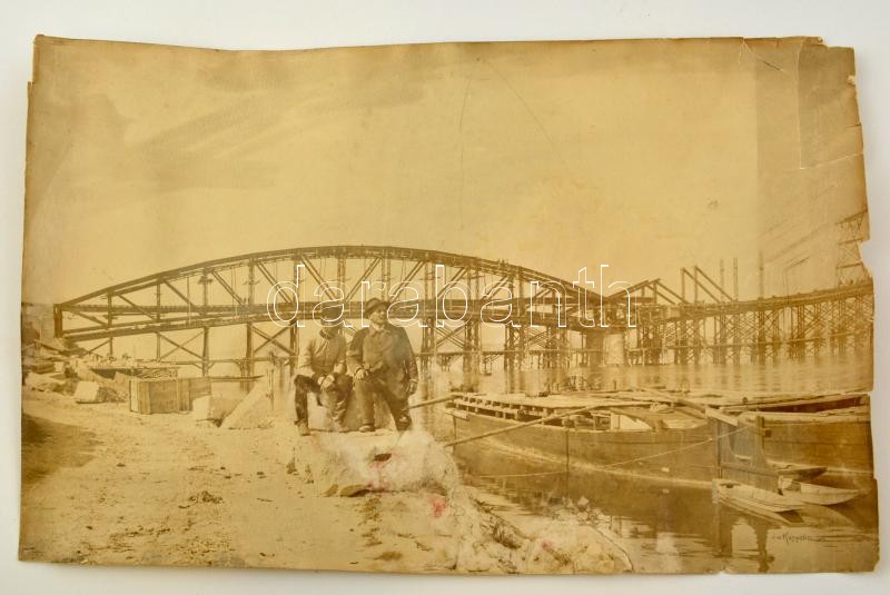 cca 1890-1910 Az épülő híd lábainál, fotó, J. v. Kappeller jelzéssel a kép sarkában, viseltes állapotban, szakadásokkal, 29x45 cm.