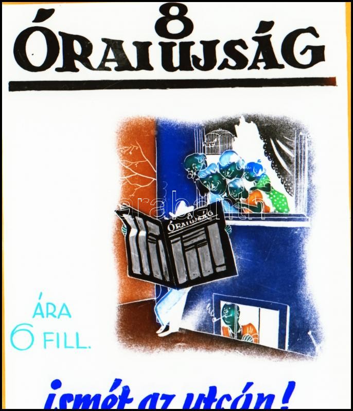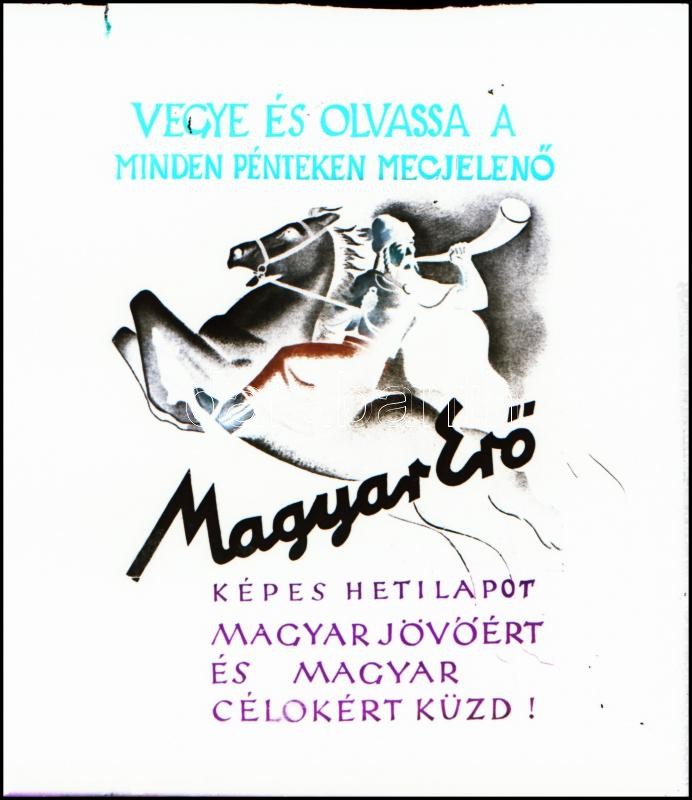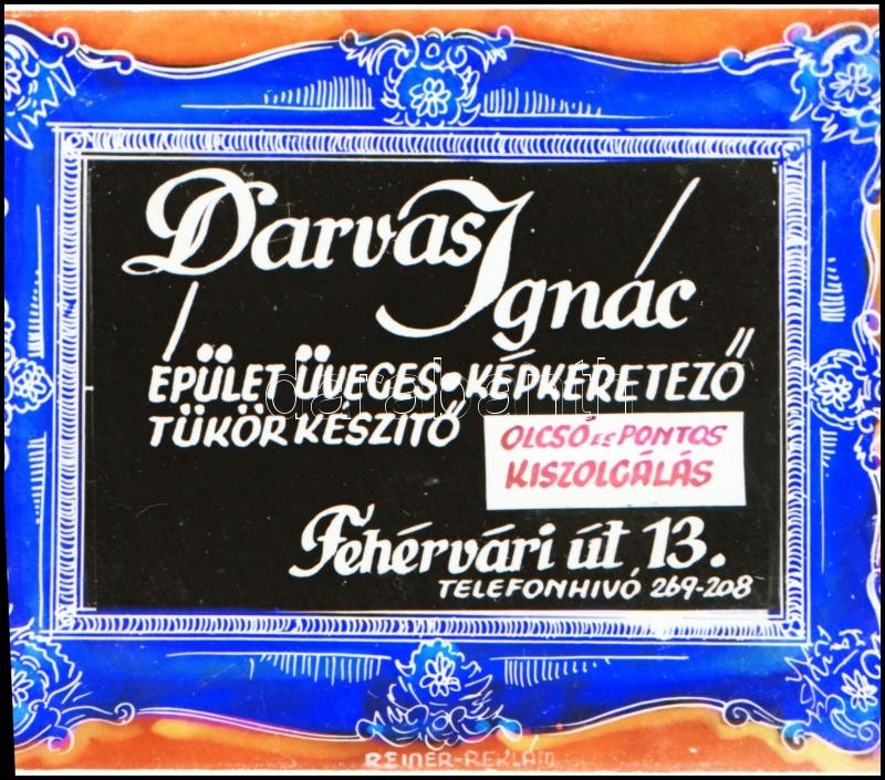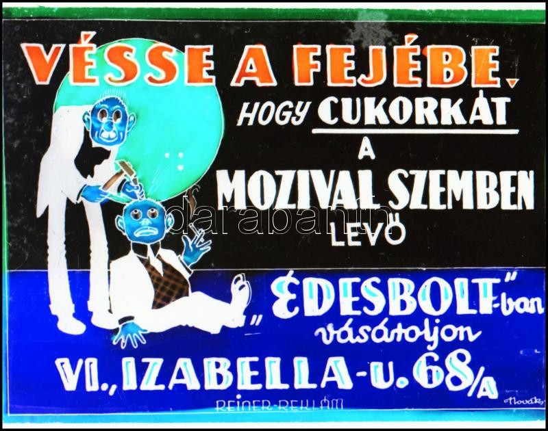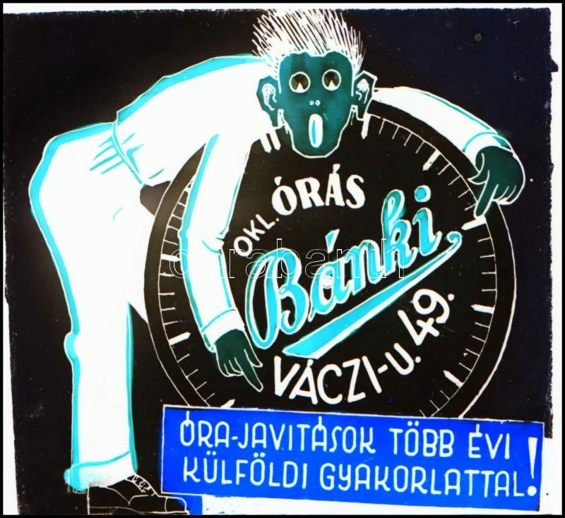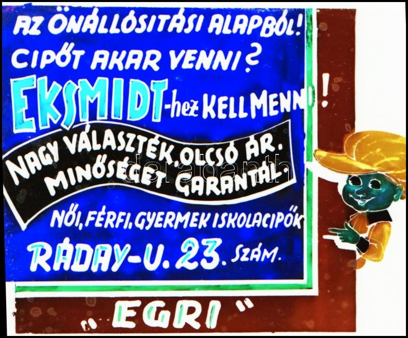 Description: cca 1947 Fekete György (1904-1990) budapesti fényképész specialitása a mozikban nagyfilmek előtt vetített álló diapozitív reklámképek voltak, ez az összeállítás különféle reklámokat, tájékoztatókat tartalmaz, 13 db diapozitív kép üveglemezen, 6x8 cm és 8x8 cm között