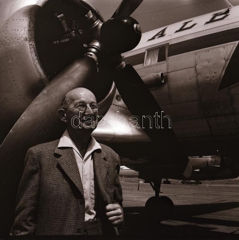 Description: cca 1965 Érdi Krausz György (1899-1972) mérnök, geodéta, térképész a Ferihegyi repülőtéren, 5 db vintage negatív Kotnyek Antal (1921-1990) fotóriporter hagyatékából, 6x6 cm