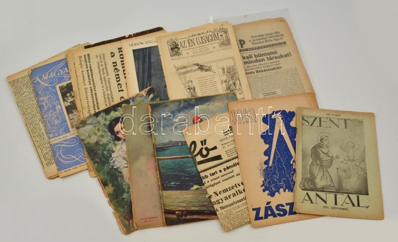 1905-1947 15 db Különféle régi újság (Új Idők, Az én ujságom, A mai nap, Rádióélet, Magyar Asszony, Szabad Nép, Otthonunk, Viradat, Reggeli Hirlap, Hétfő, Zászlónk, Szent Antal, Pesti Hirlap Vasárnapja), változó, többnyire szakadozott állapotban.