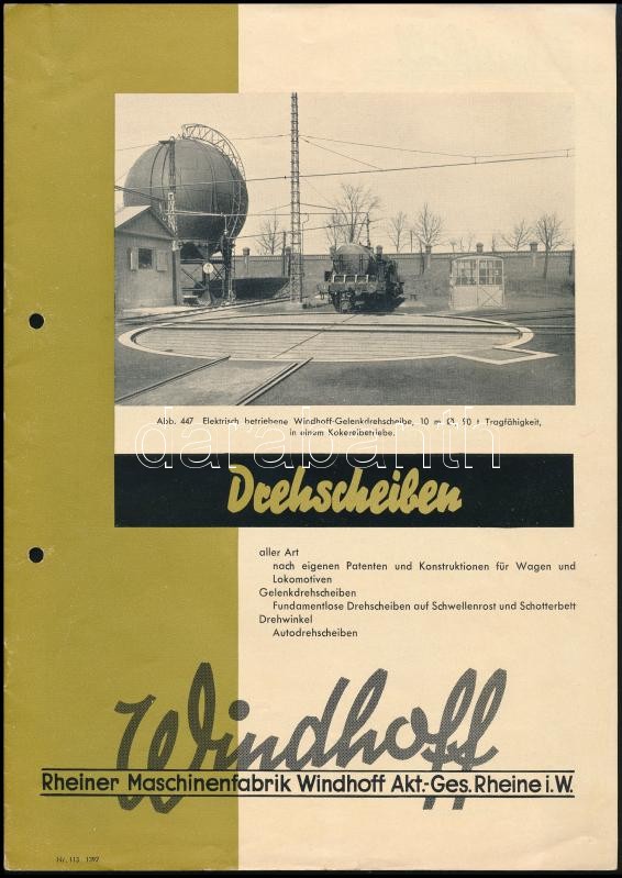 cca 1920-1930 Drehscheiben Rheiner Maschinenfabrik Windhoff gyár katal... https://www.darabanth.com/en/290-Online-auction/290.0/Other-collectibles/Printed-Materials~100028/cca-1920-1930-Drehscheiben-Rheiner-Maschinenfabrik-Windhoff-gyar-katalogusa-szamos-fekete-feher~II1531802