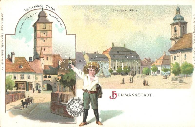 Description: Nagyszeben, Hermannstadt, Sibiu; Fő tér, Kis tér a Városi toronnyal, Leonhardi tinta reklámja / Leonhardi's Tinten advertisement, Verlag von Aug. v. Leonhardi litho
