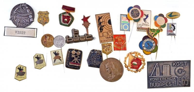 Description: 25db-os vegyes, nagyrészt magyar vonatkozású jelvény és kitűző tétel, közte "Táncverseny 1971", "M7 út építéséért", "Miskolci Film Fesztivál", "Közlekedési Múzeum Budapest - Derű" , valamint 1956. "KGST Konferencia Budapest" fém kitűző (35x54mm) T:2,2-