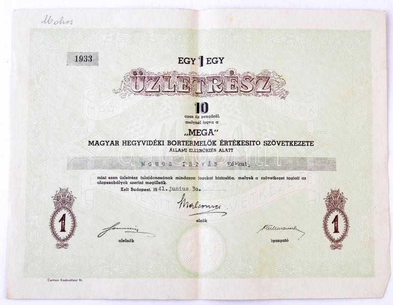 Budapest 1941. "MEGA - Magyar Hegyvidéki Bortermelők Értékesítő Szövet... https://www.darabanth.com/en/291-Online-auction/291.0/Numismatics/Shares-and-Tickets~200005/Budapest-1941-MEGA--Magyar-Hegyvideki-Bortermelok-Ertekesito-Szovetkezete-Allami-Ellenor~II1536803