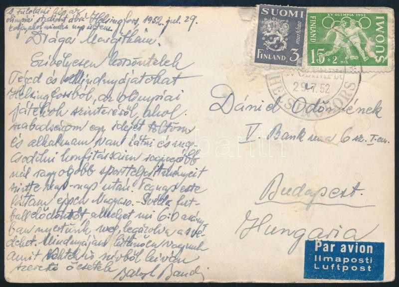 Description: 1952 Balogh Ambrus olimpia bronzérmes sportlövő hazaküldött képeslapja a Helsinki olimpiáról benne a Magyarország-Svédország, 6:0 arányban megnyert labdarúgómérközés említésével