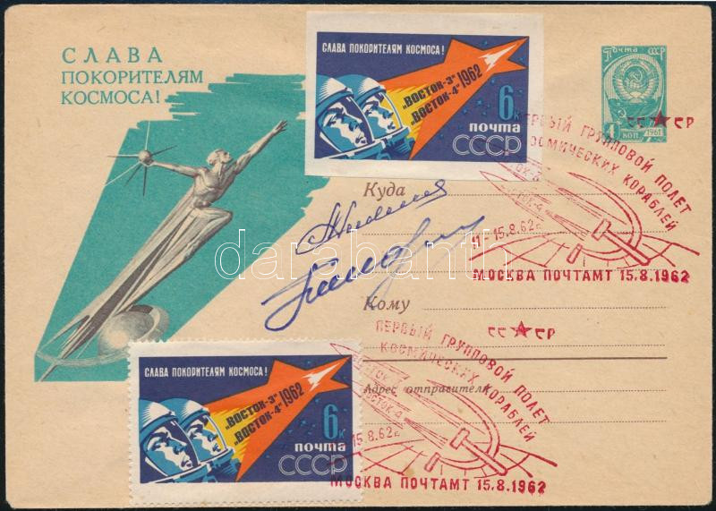Description: Pavel Popovics (1930-2009) és Adrijan Nyikolajev (1929-2004) szovjet űrhajósok aláírásai emlékborítékon /