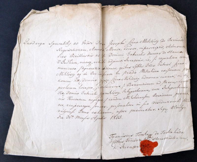 1805 Királyi, latin nyelvű okmány birtokügyben, Gömör-Kishont vármegye esküdtjének aláírásával és viaszpecsétjével