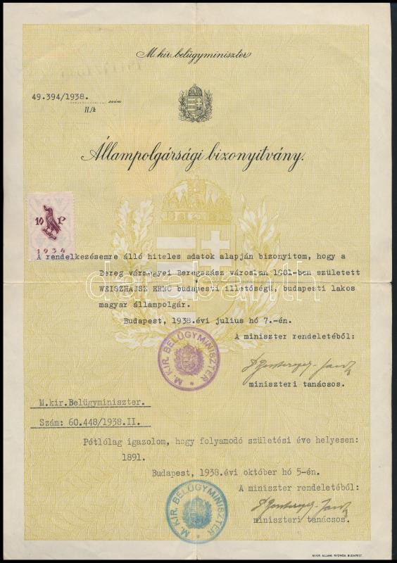 1938 Állampolgársági bizonyítvány