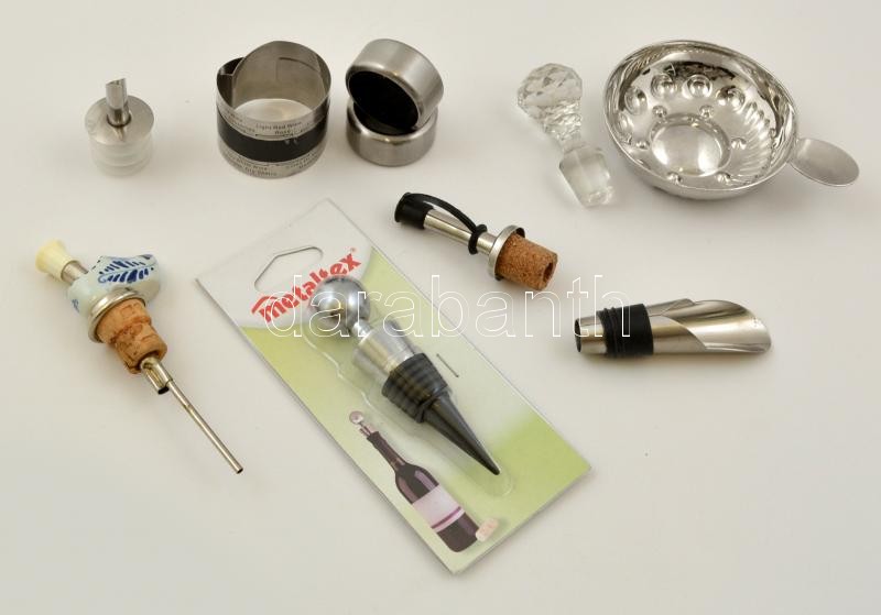 Borászati kellék tétel: különféle kiöntők, dugók, borkóstoló tálka, stb., összesen 10 db