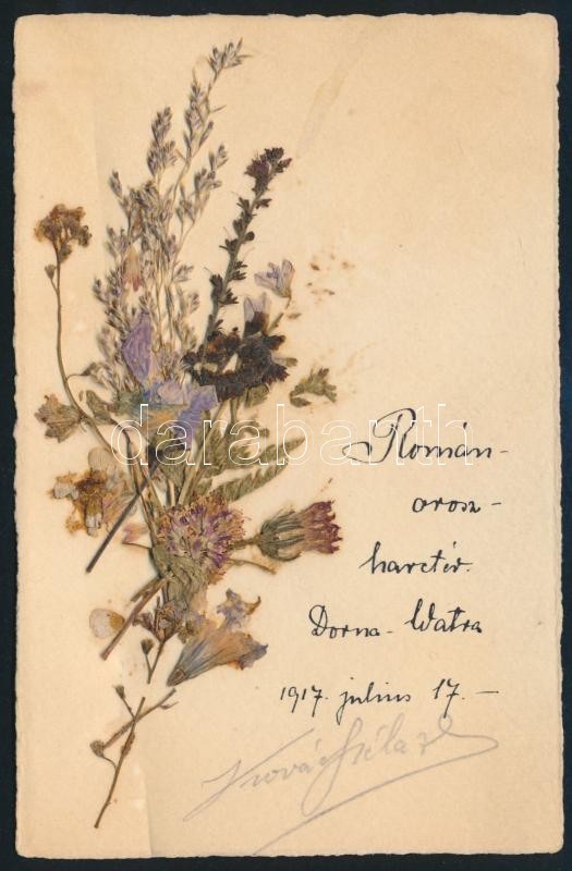 Description: 1917 Első világháborús román-orosz harctéri emlék, Dorna-Watra (Dornavátra, Vatra-Dornei), alírással, 14x9 cm./