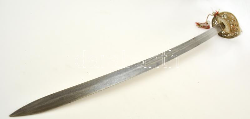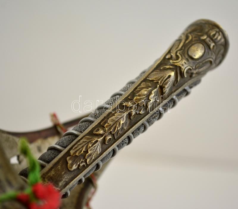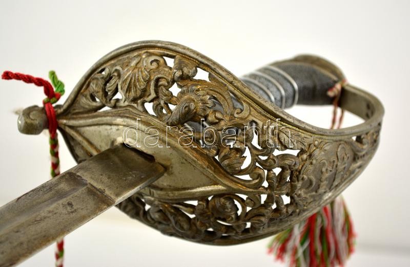 Osztrák-magyar bányász tiszti kard, díszes markolattal, a kosáron "Glück auf!" felirattal, magyar trikolóros kardbojtokkal, kardgombja hiányzik, pengehossz: 75,5 cm, teljes hossz: 89,5 cm / Austro-Hungarian mining officer's sword with richly ornated hilt, with "Glück auf!" inscription on the branch, with sword knot in the colours of the Hungarian tricolour, the pommel is missing, blade length: 75,5 cm, full length: 89,5 cm