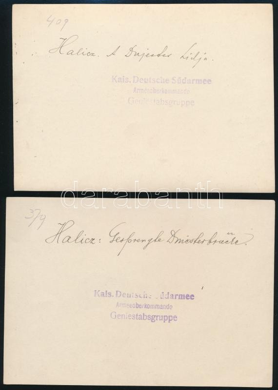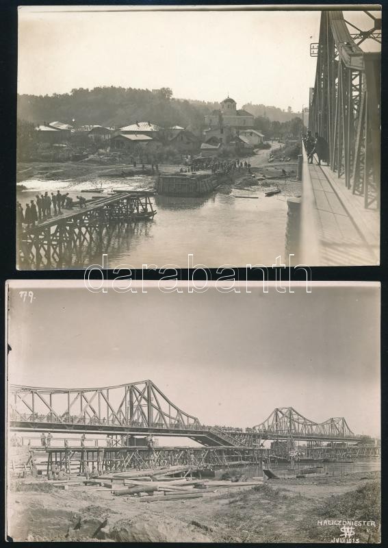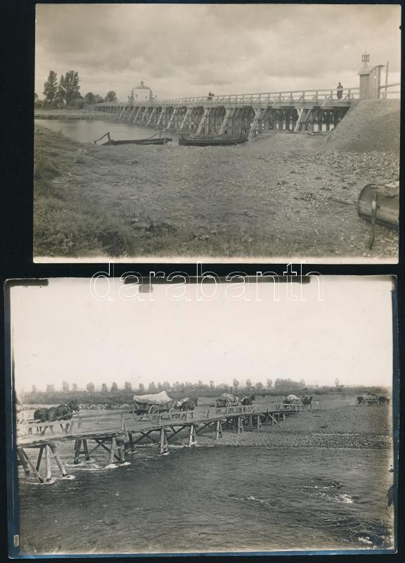 cca 1914-1918 Keleti front, a Dnyeszter hídja, 4 db fotó, hátuljukon feliratozva, katonai pecséttel jelzettek, 13×18,5 cm / cca 1914-1918 Eastern front, the bridge of the Dniester, 4 photographs, with notes on their back, signed with army seal, 13×18,5 cm