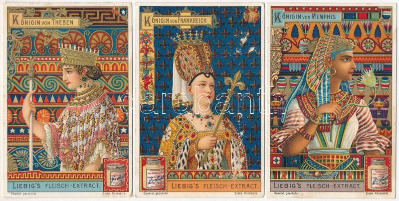 6 db királynémotívumos gyűjtői litho reklámkártya (Liebig's Flesich-Ex...