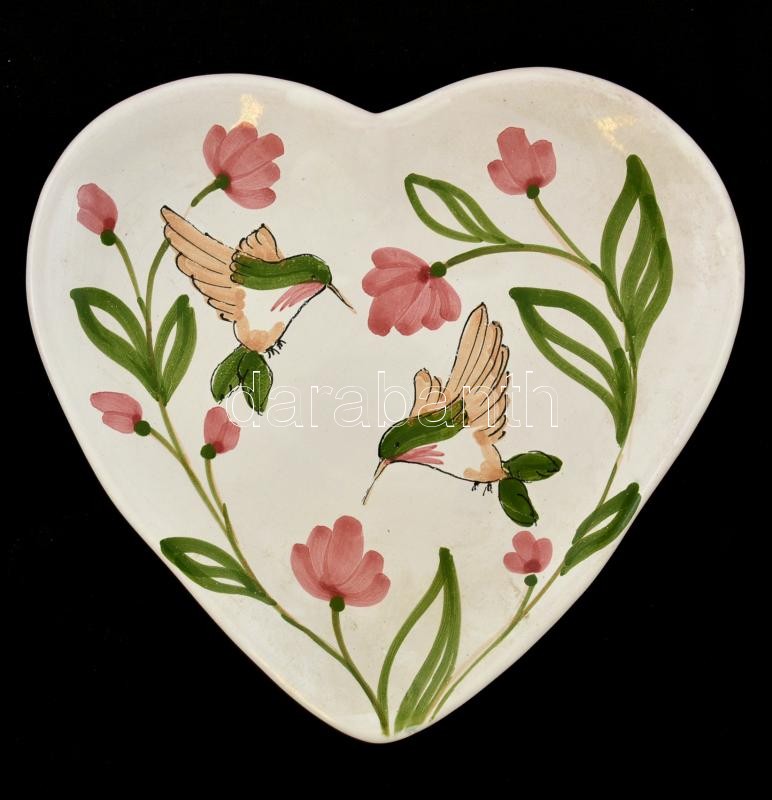 Szív alakú kézzel festett fali tál, mázas kerámia, jelzett ( Bodza), h...